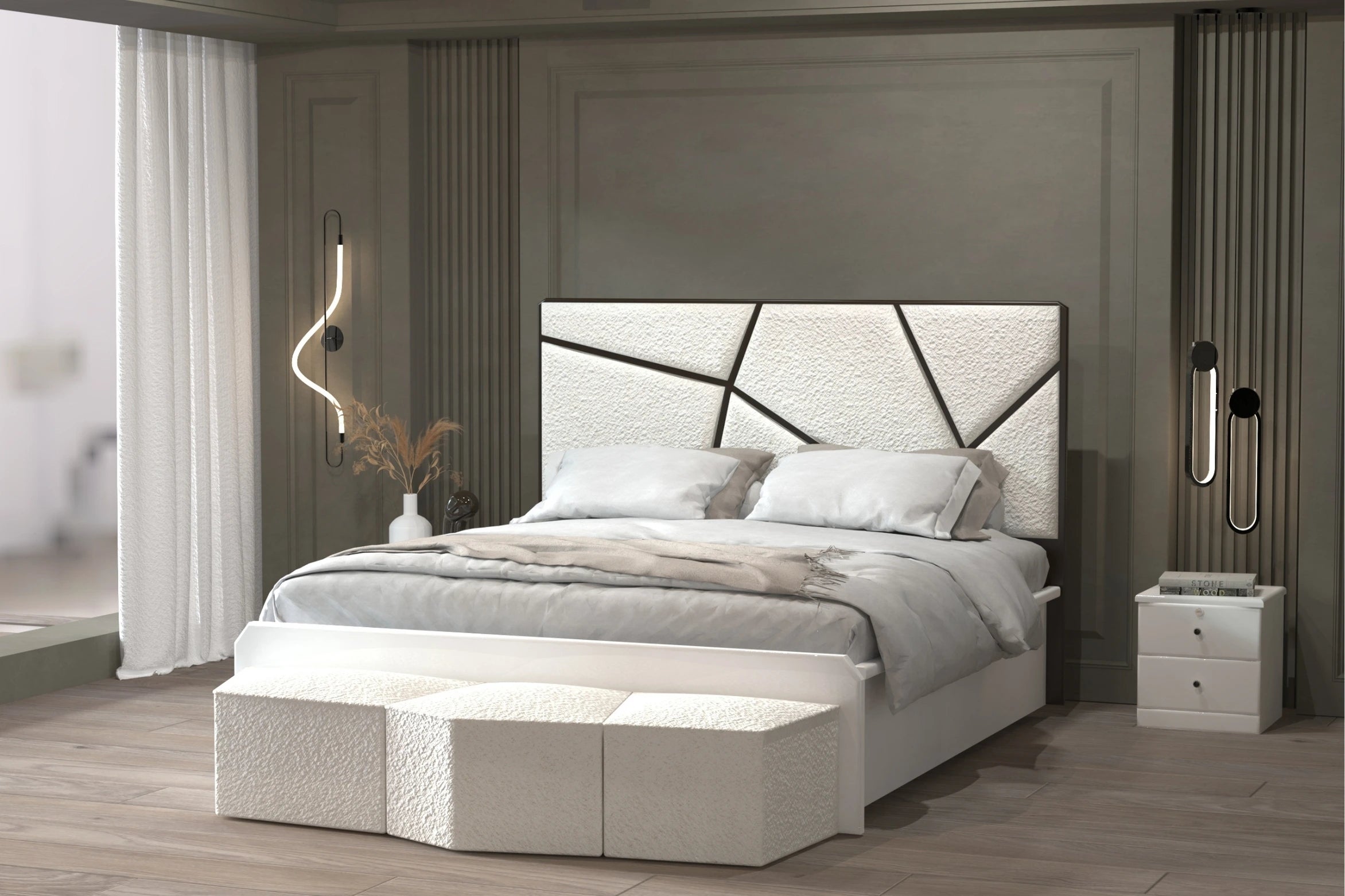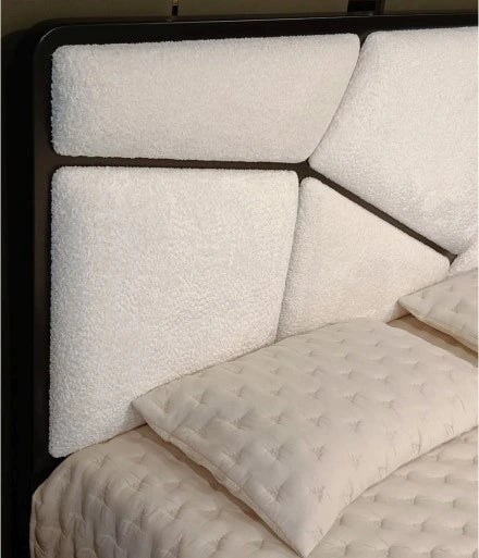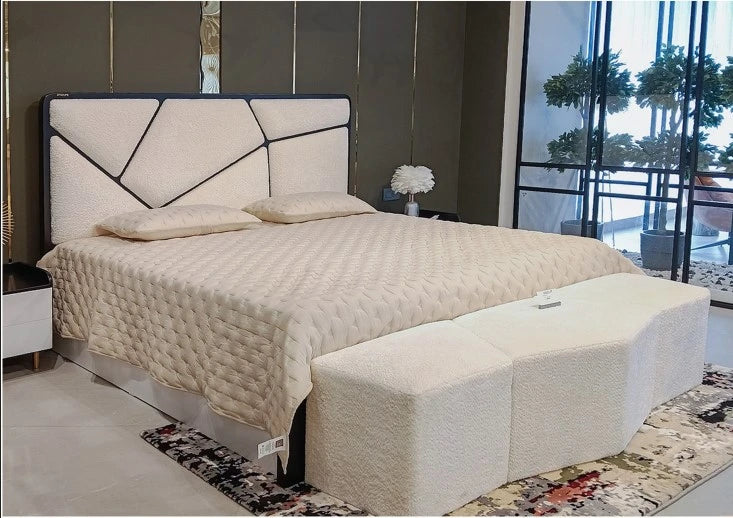 The Berry bed blends comfort with a striking modern design. Its geometric headboard adds visual depth, while the soft fabric finish enhances the cozy feel. Built with a sturdy wood and HDF frame, it ensures long lasting strength and stability, making it a refined centerpiece for any contemporary bedroom.