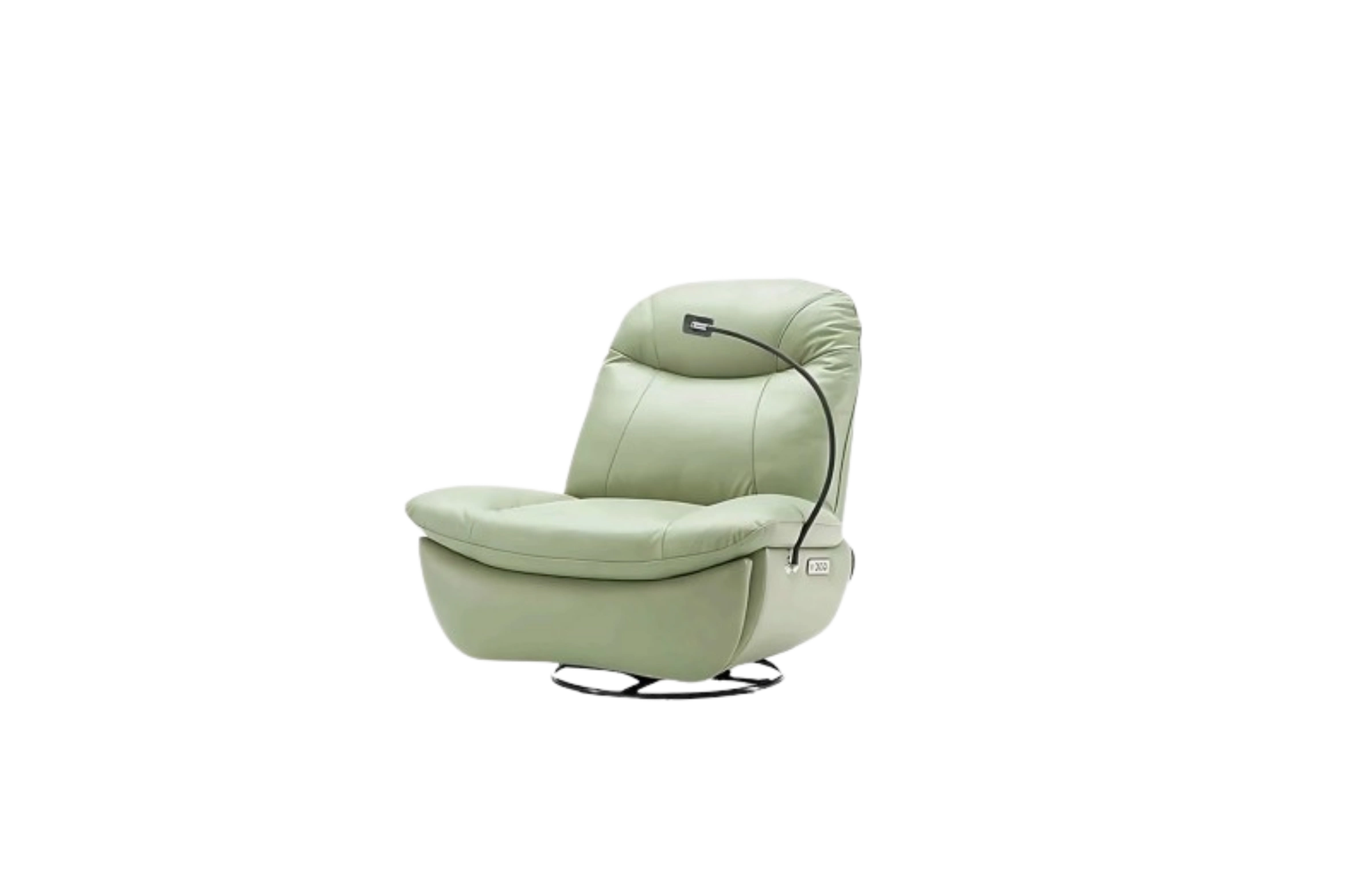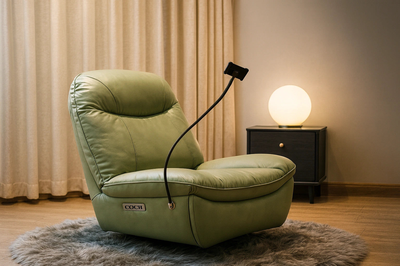 Experience effortless comfort with the Clara recliner, crafted for relaxation and modern convenience. Equipped with a built in charging port, phone holder, and adjustable leg rest, it ensures a personalized seating experience. The smooth reclining switch adds ease to every moment, blending comfort and sophistication in one elegant design.
