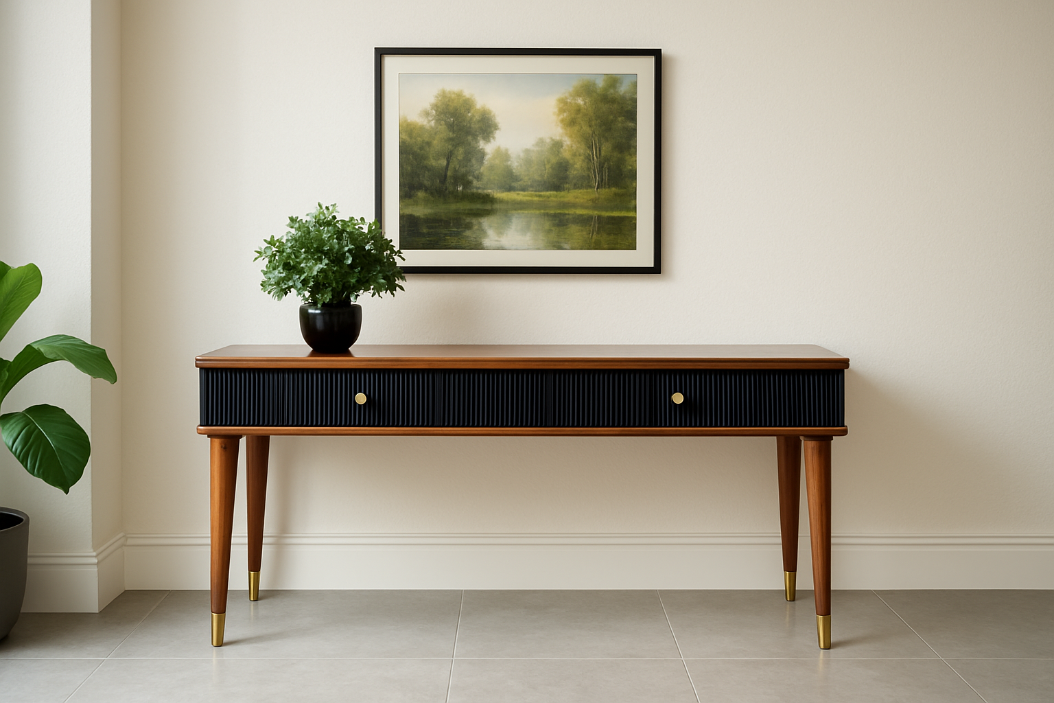 Bring refined simplicity to your space with the Nova Console. Crafted with a rich teak wood finish and a sleek HDF body, it blends timeless design with modern functionality. The gold detailed legs and textured drawers enhance its elegant look, making it perfect for hallways, living rooms, or stylish entryways.