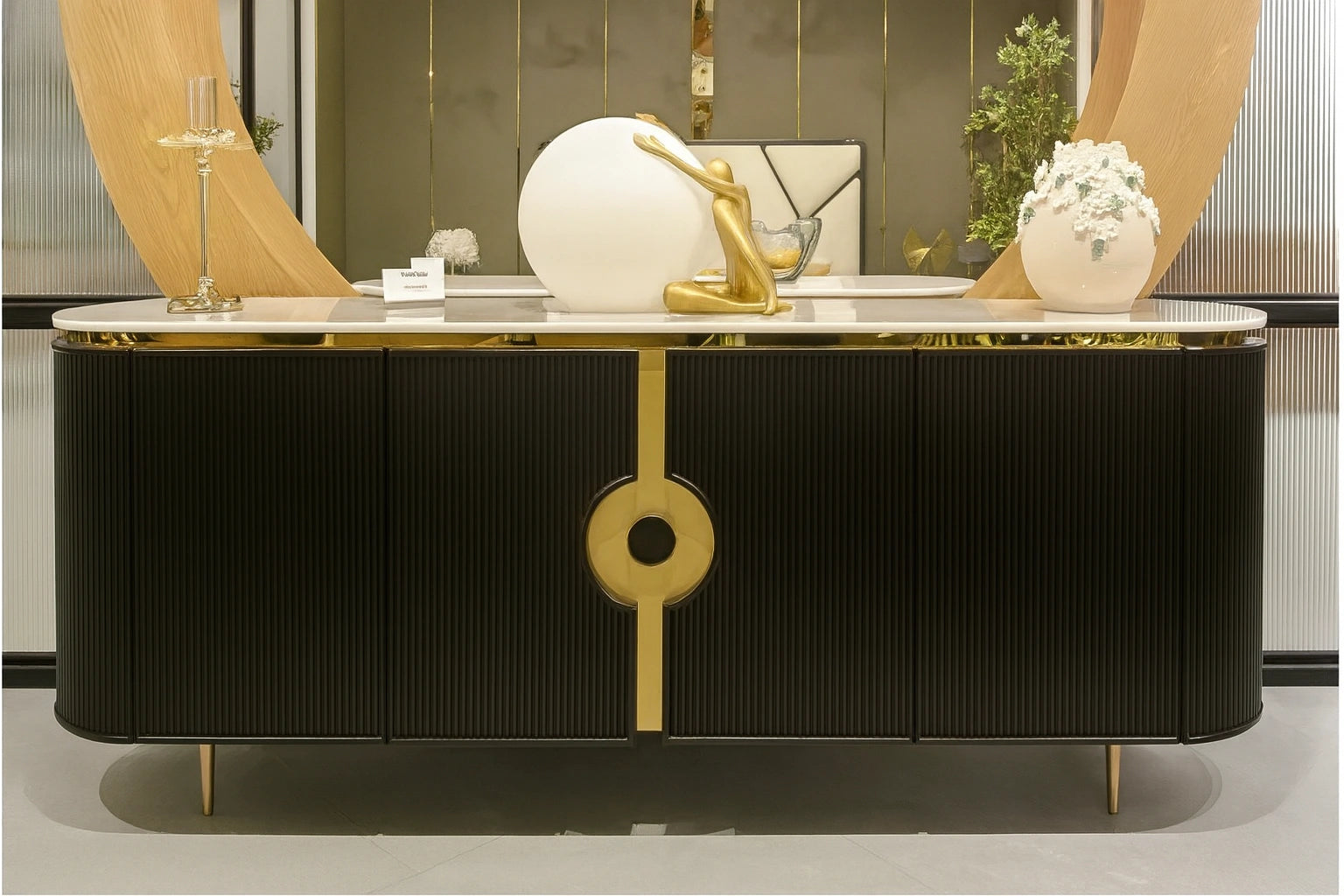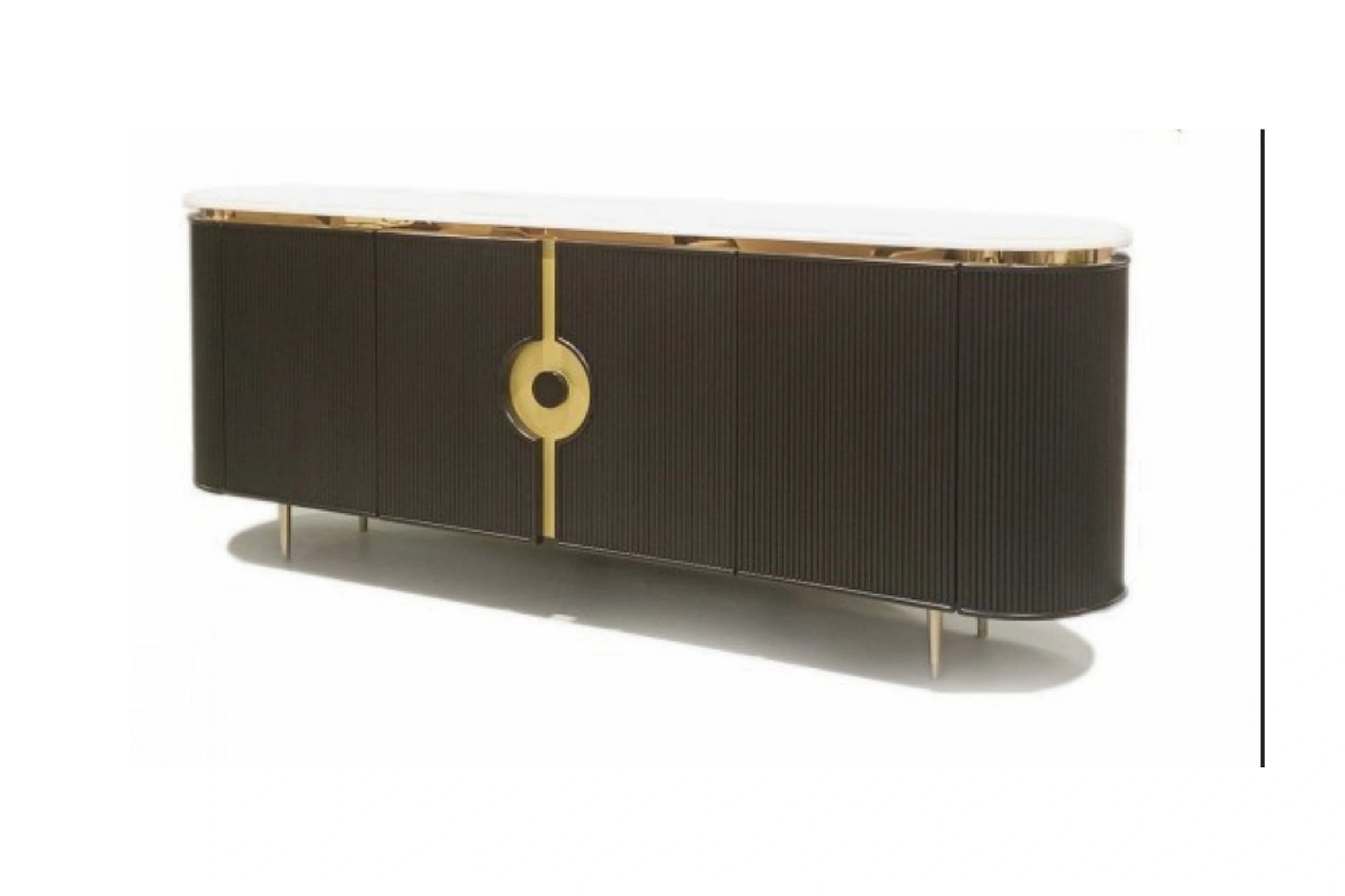 Experience refined luxury with the Stria console. Its elegant fluted design, accented with golden detailing and a smooth marble top, adds sophistication to any interior. Ideal for living or dining spaces, this piece combines modern craftsmanship with timeless beauty, serving as both a functional storage unit and a statement feature.