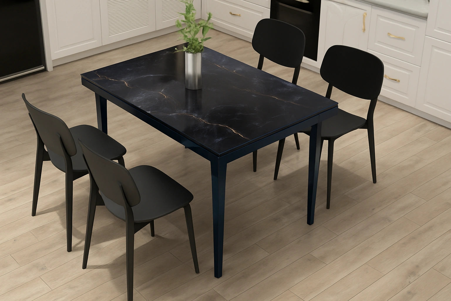 Modern elegance defines the Meloni dining table, designed to complement compact spaces with a refined touch. The smooth HDF top offers a sleek, durable surface, while the sturdy metal frame ensures stability and lasting support. Its clean lines and dark finish bring sophistication to any contemporary dining setting.