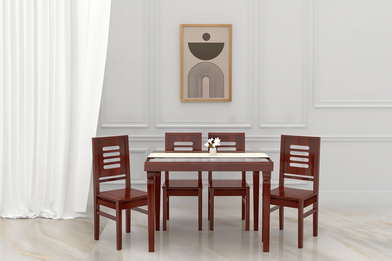 Elegant in form and timeless in appeal, the Quatro dining set brings sophistication to any dining area. The ceramic tabletop adds a touch of refinement, while the golden shower wood frame and matching chairs provide durability and warmth, creating a balanced blend of natural beauty and everyday functionality.