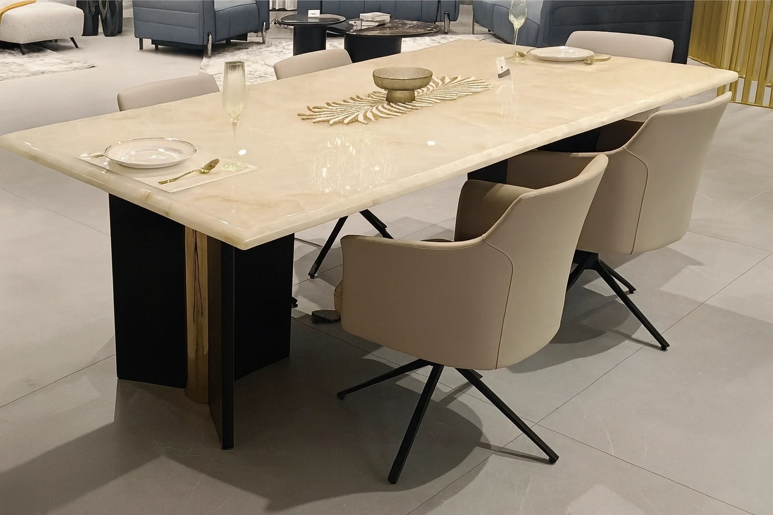 Sophisticated in form and rich in texture, the Rino dining table redefines modern luxury. The smooth Onyx marble top radiates elegance, while the sturdy HDF and metal leg base add balance and strength. Perfect for family meals or hosting guests, this table brings refinement and durability to every dining space.