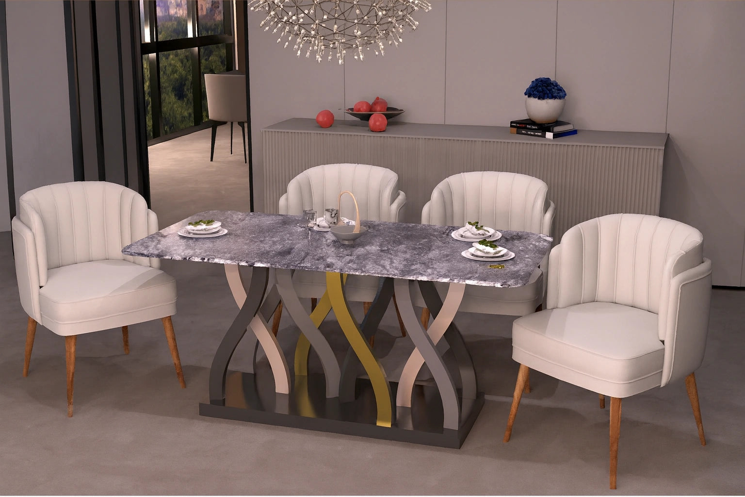 Graceful design defines the Taz dining table, a six-seater masterpiece that combines luxury and strength. Its polished marble top brings a refined touch to dining spaces, while the sculpted High-Density Fiberboard (HDF) frame ensures lasting stability. The artistic curves of the base create a perfect balance of style and sophistication.
