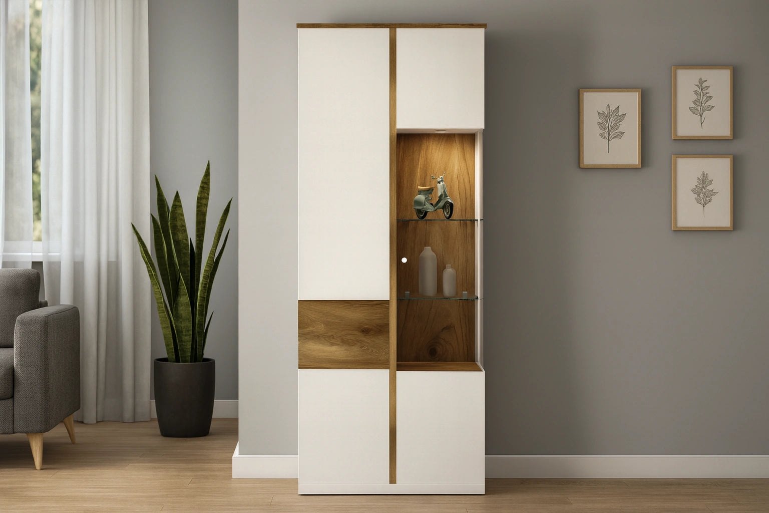 Designed for modern elegance, Jordan blends simplicity with smart functionality. Its dual-tone finish and sleek structure bring warmth to any interior. The glass display section highlights décor pieces beautifully, while ample closed storage keeps essentials hidden and organized, making it a perfect balance of style and purpose.