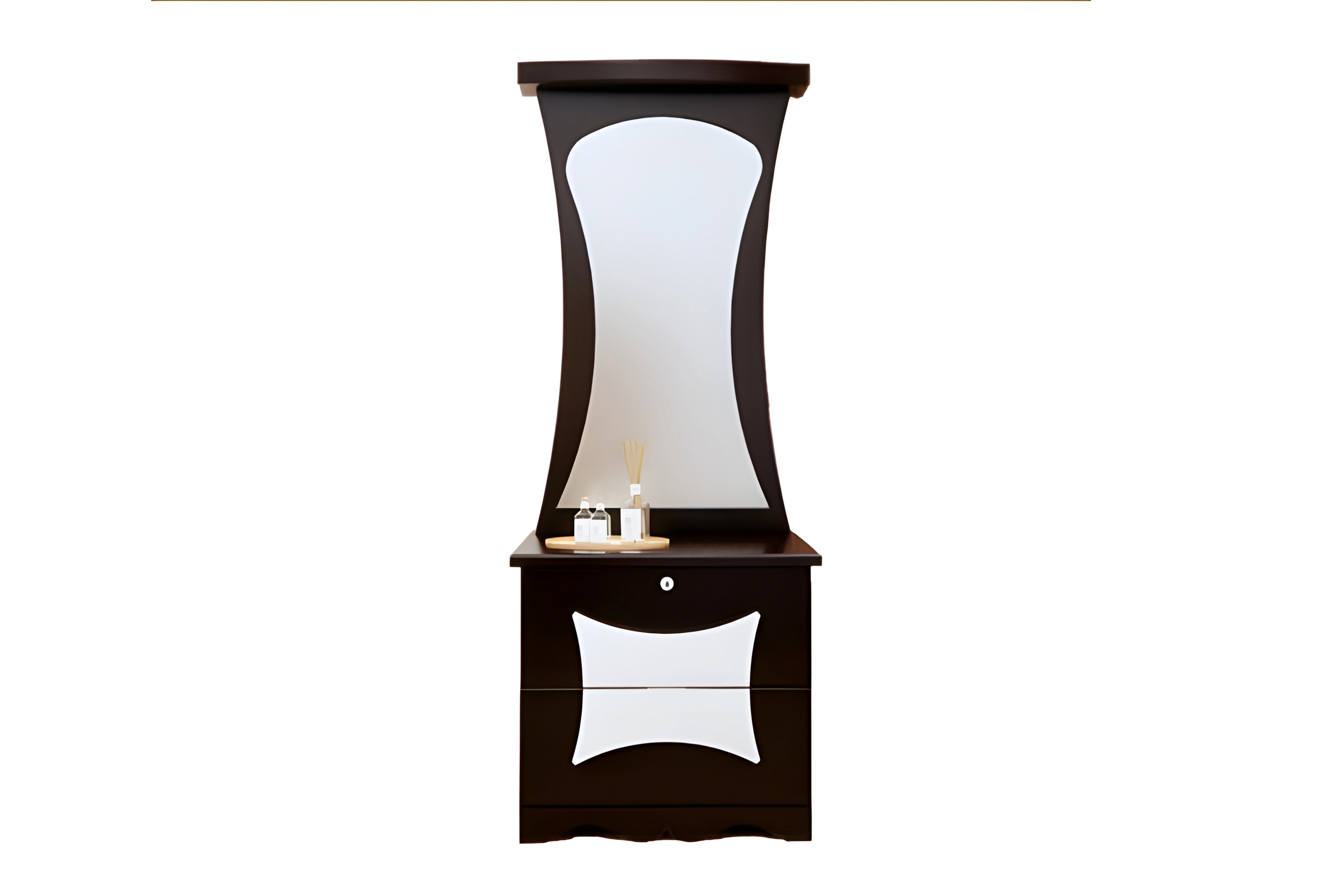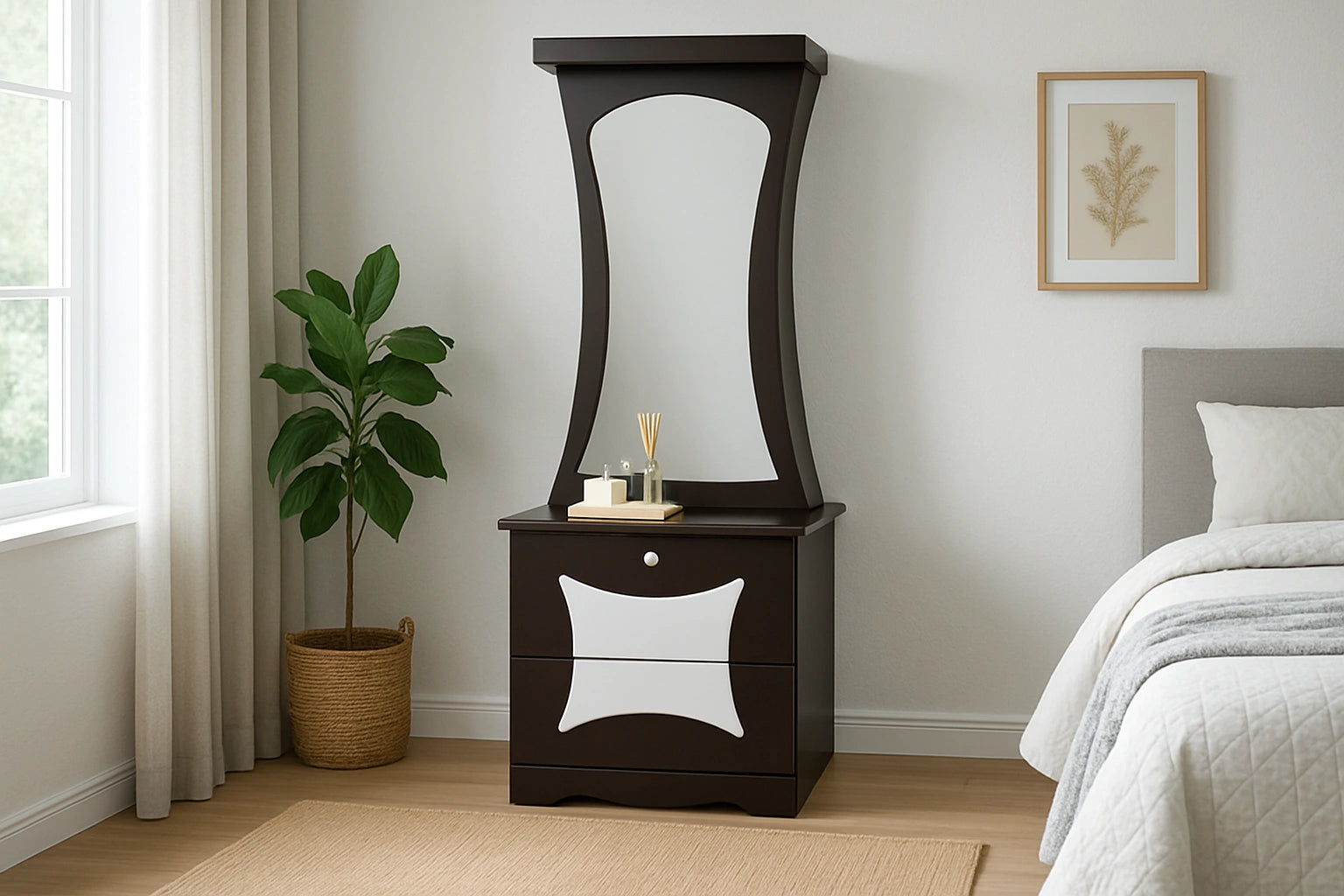 Crafted for elegance and everyday use, Moon 2 adds charm and utility to your space. Its graceful curved mirror enhances the room’s brightness, while the drawers offer organized storage. The rich dual tone finish and sleek structure make it a stylish, functional addition to any modern bedroom.