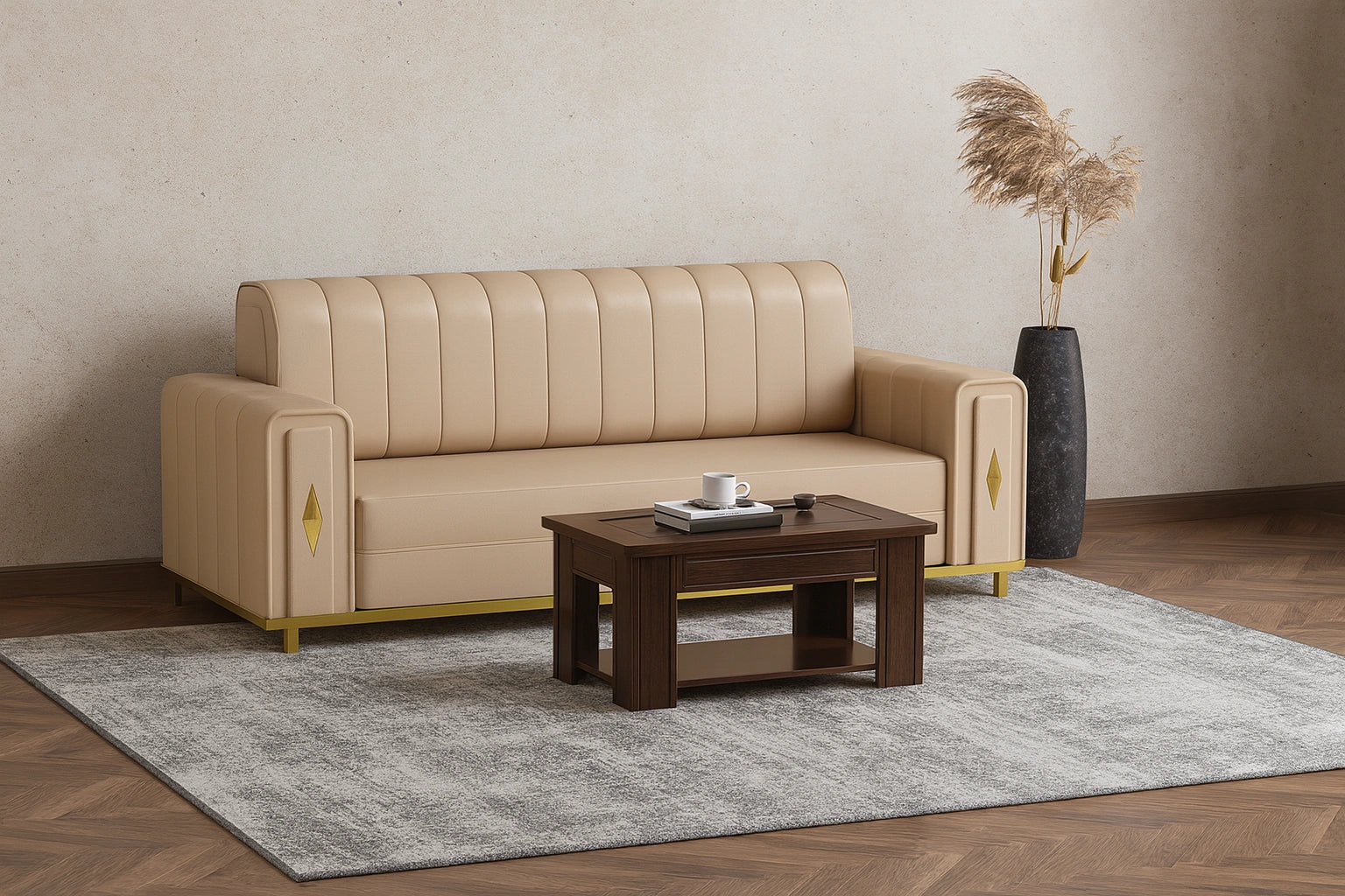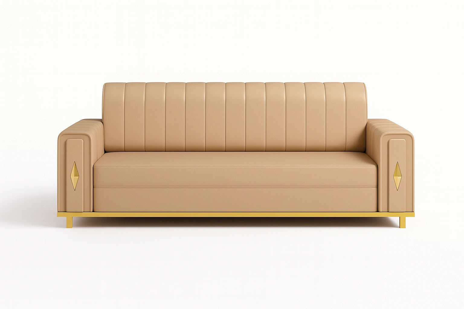 Designed with a balance of style and function, the Blissi sofa brings a refined elegance to any living space. The vertical stitch detailing and golden accents highlight its premium craftsmanship. Wrapped in smooth vegan leather and supported by a golden shower wooden frame, it offers both durability and timeless appeal.