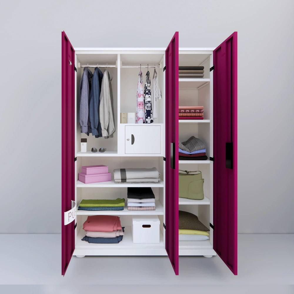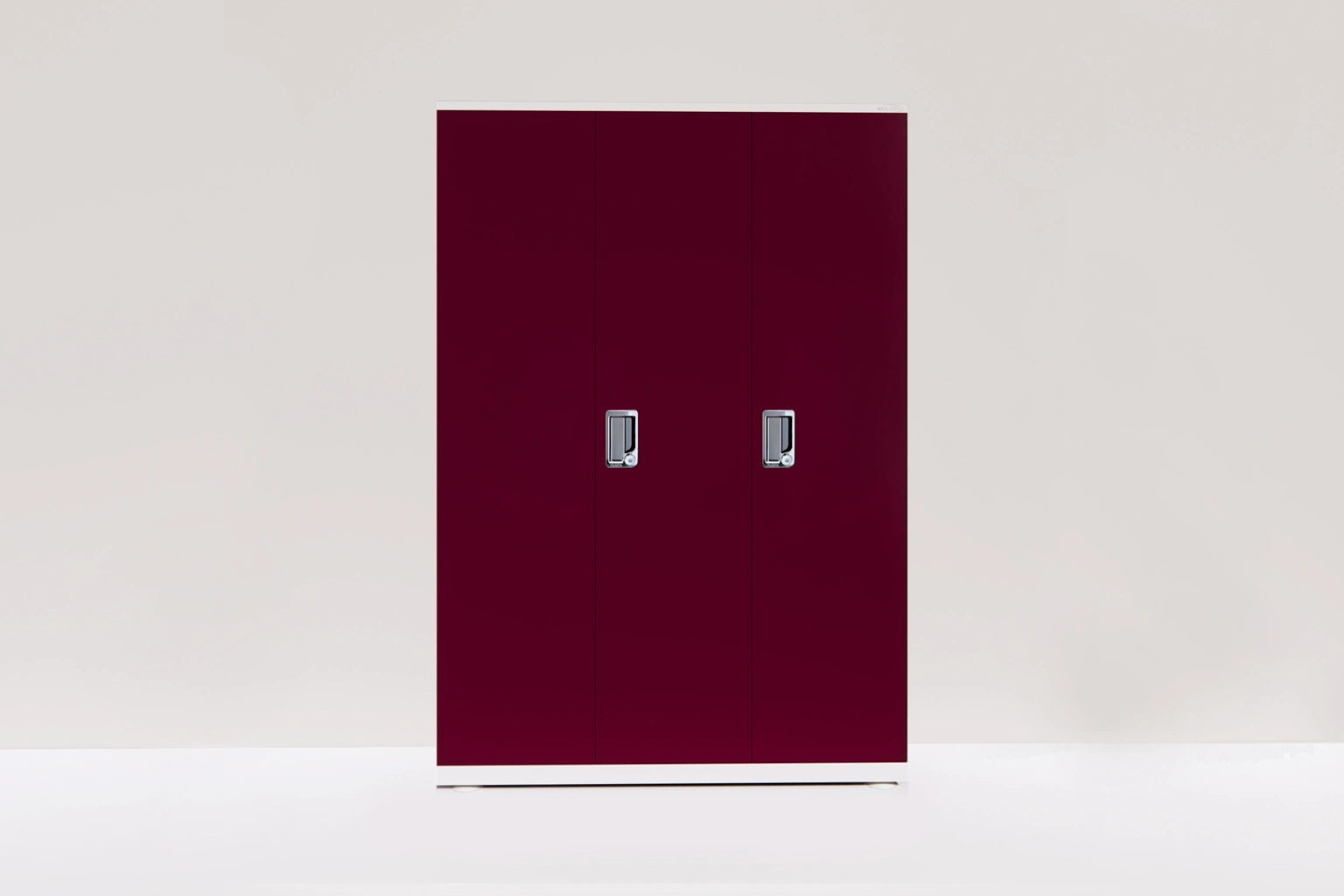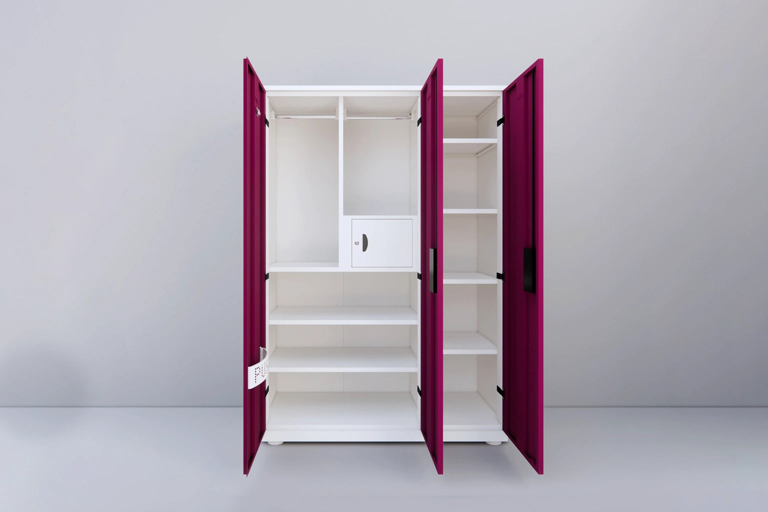 PF12 3Door Almirah offers a clean, modern form with a deep magenta finish that complements any space. Designed for efficiency, it combines smooth operation and strong build quality. Crafted from durable steel and equipped with premium metal locks, it ensures safety, elegance, and long lasting performance for your storage needs.