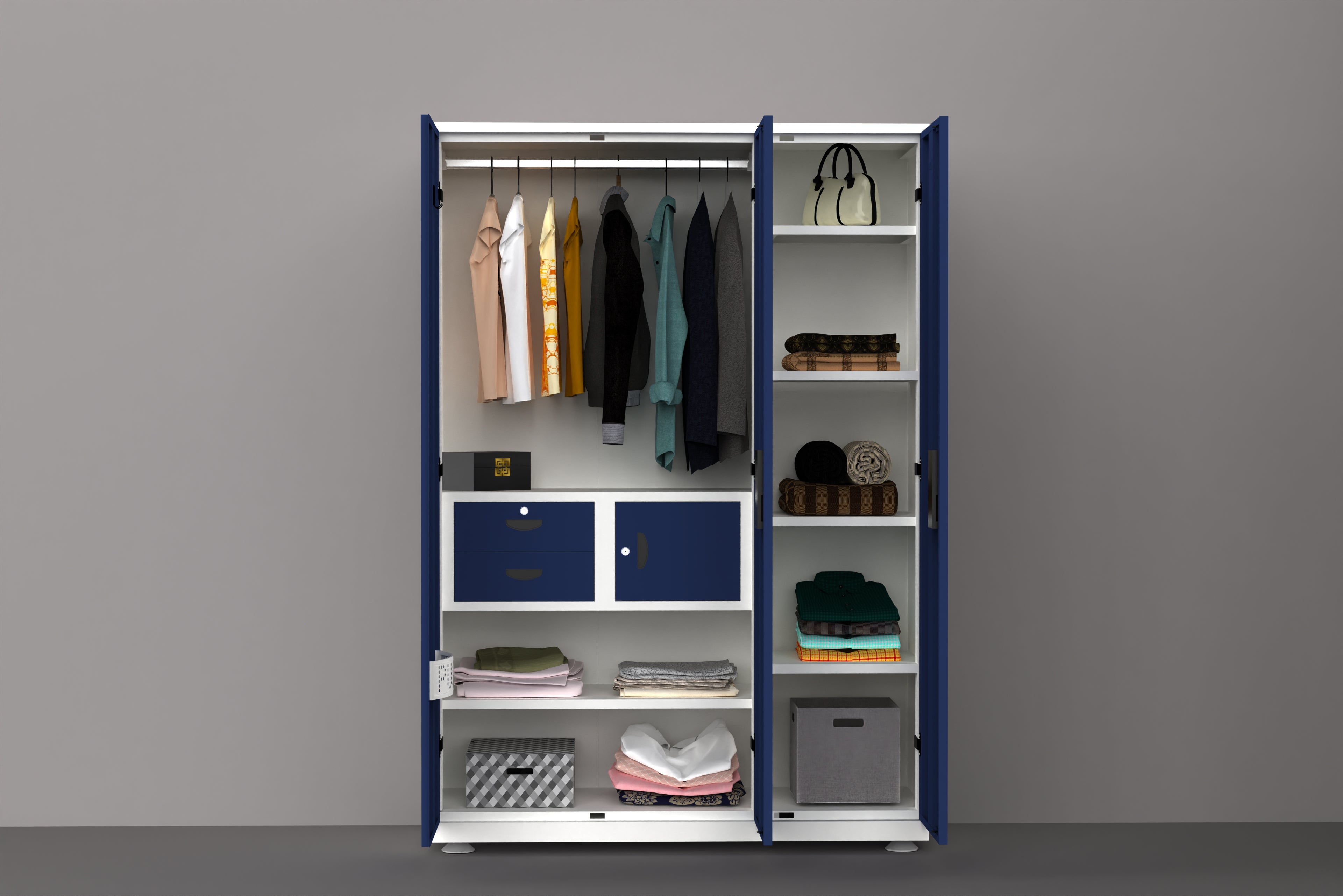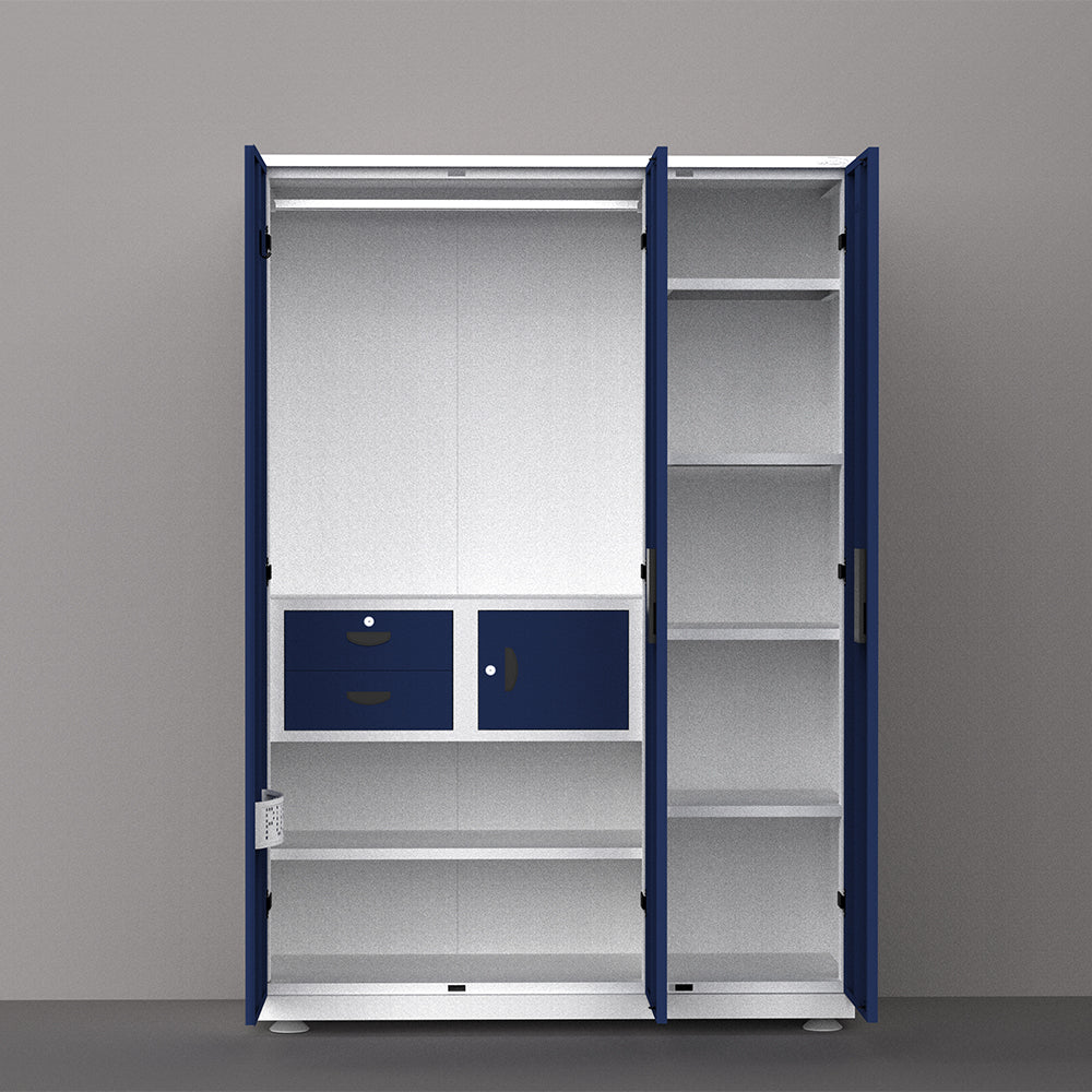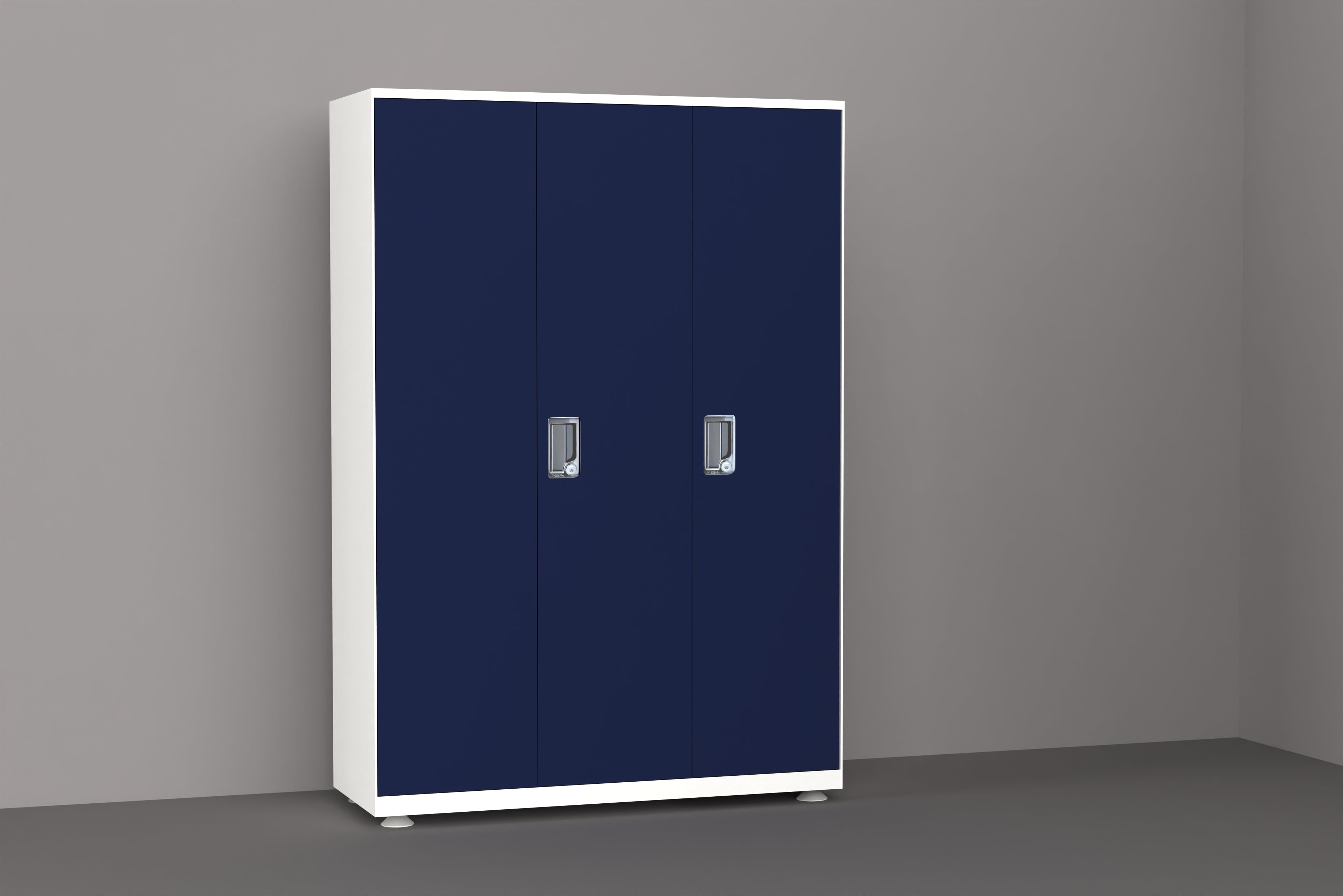 PF 4 Steel Almirah is a heavy-duty 3-door wardrobe crafted from premium steel with a durable powder-coated finish. It features spacious hanging storage, multiple shelves, two smooth drawers, and a secure internal locker. Strong hinges, branded locking system, and adjustable legs ensure long-lasting performance and organized storage.