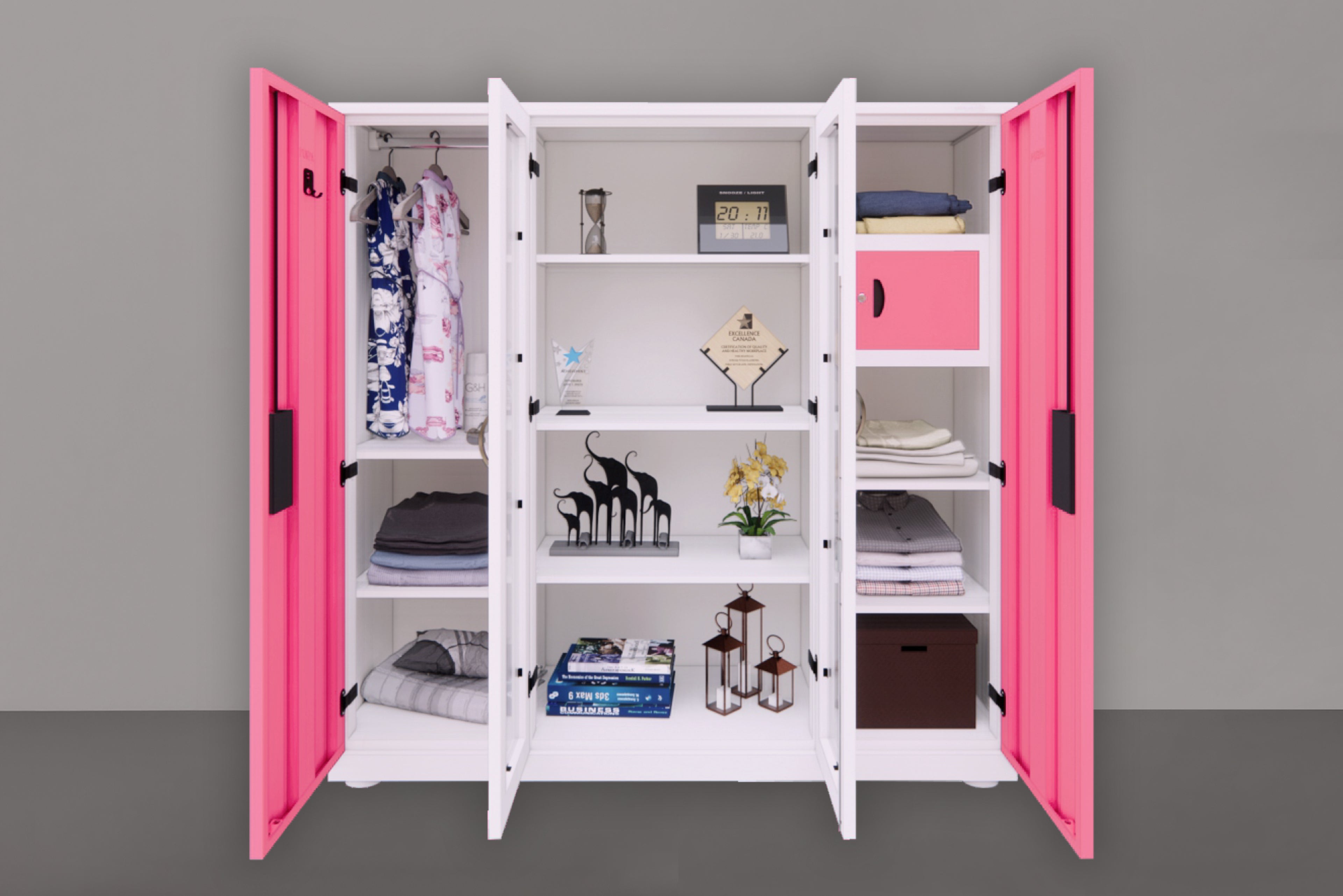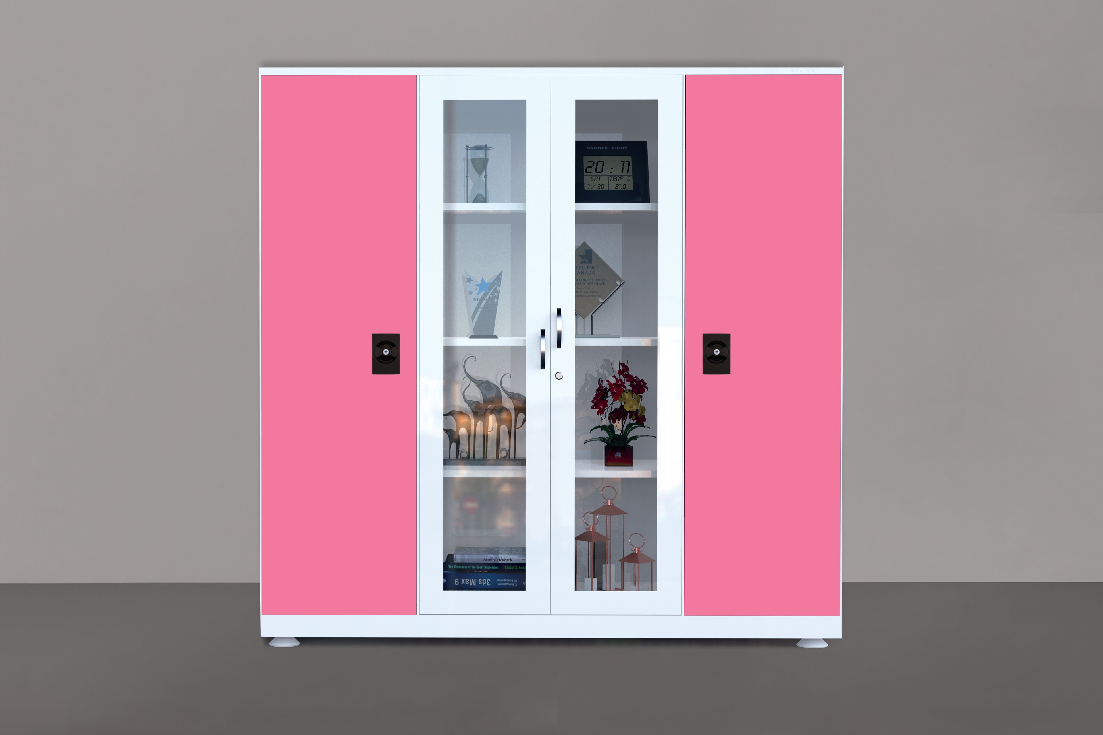 PF Showcase is a stylish steel storage cum display cabinet with twin glass doors and vibrant side panels. Inside, it offers a hanging rod, multiple shelves, and a secure locker for valuables. Ideal for bedrooms, hostels, and offices, it keeps clothes, files, and décor neatly organised for easy access daily.