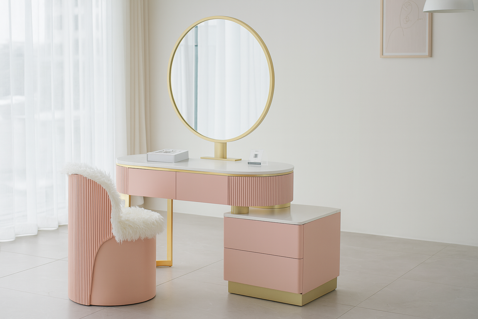The Bonny Dressing Table redefines elegance with its chic pastel tones and modern curves. Designed for both style and comfort, it blends soft femininity with premium craftsmanship. The gold accents add luxury, while the plush fabric chair enhances the overall charm making it a perfect vanity statement piece.