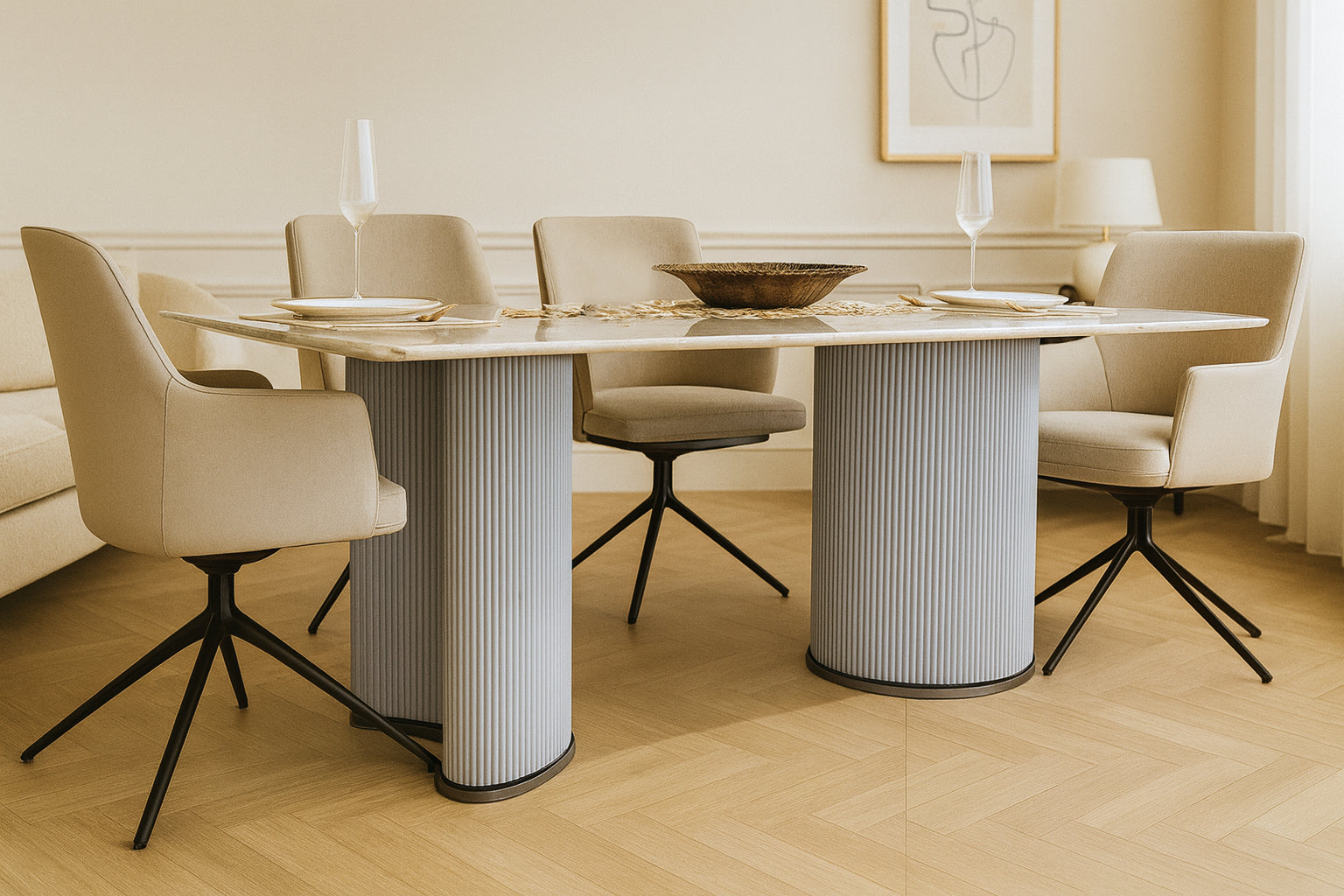 Elevate your dining experience with the exquisite Moon Marble Dining Table. Its seamless blend of premium onyx marble and finely crafted HDF creates a perfect harmony of strength and style. The sculpted cylindrical base enhances visual appeal, making it an elegant centerpiece for modern dining spaces.